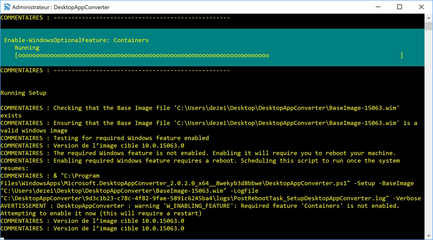 Une console, semblable à l’invité de commandes doit normalement s’ouvrir. Si vous n’avez pas ouvert l’application en administrateur vous devriez avoir un message d’erreur en rouge apparaître. La première commande que nous allons devoir exécuter et donc la suivante Set-ExecutionPolicy bypass, afin de modifier les préférences utilisateurs dans cette instance. Puis, maintenant que vous avez téléchargé votre BaseImage, le fichier .wim, il nous faut donc configurer le convertisseur pour le prendre en compte, pour ce faire, cette simple commande suffit, a exécuté à partir de l’application Desktop App Converter DesktopAppConverter.exe -Setup -BaseImage cheminverslefichier/BaseImage-1XXXX.wim -Verbose en remplaçant les X par le numéro de version présent dans le nom de votre fichier et le chemin correspondant à votre environnement.