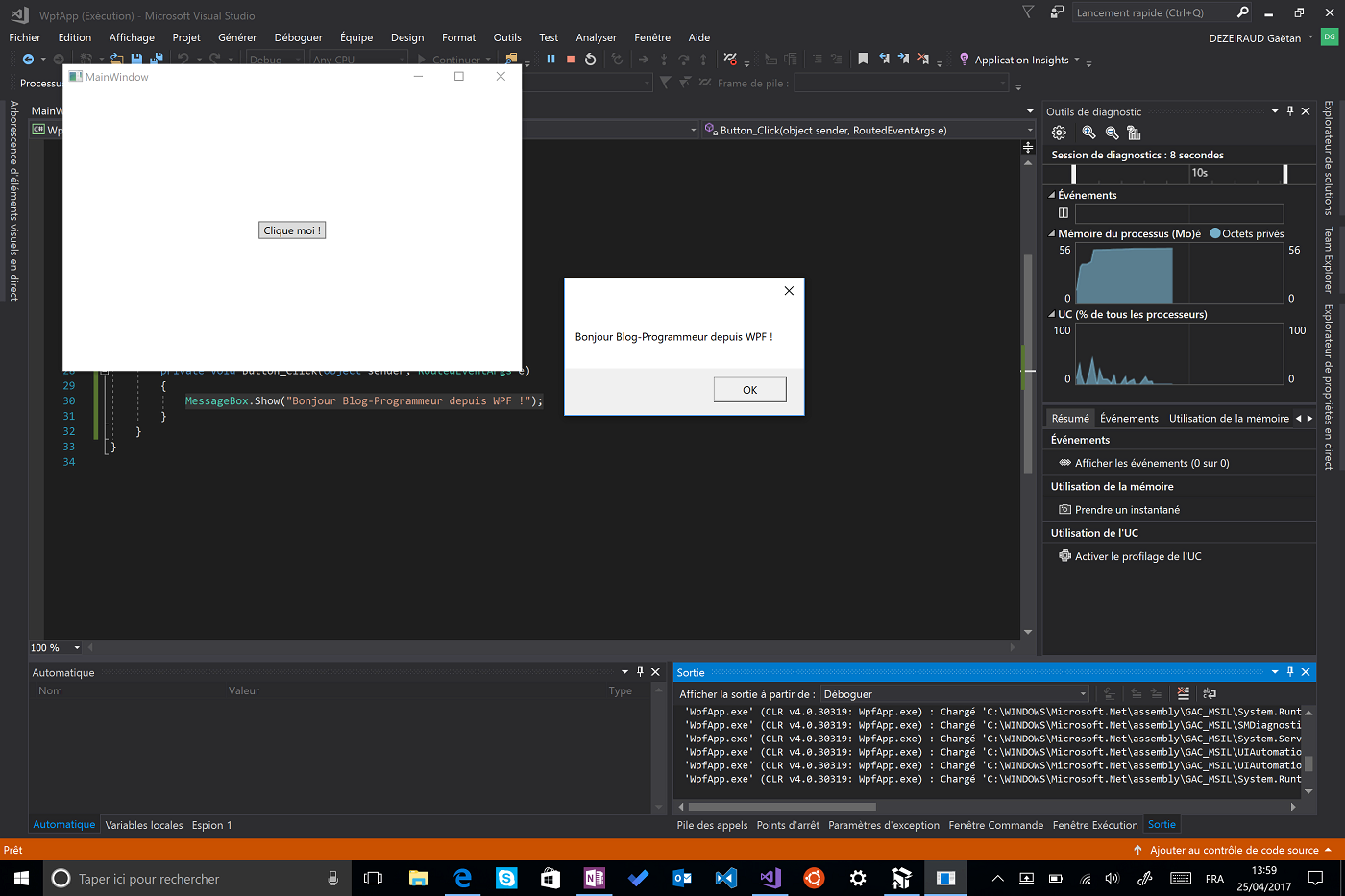 Je glisse donc un simple bouton au milieu de l’éditeur visuel, dans les propriétés (disponible en bas à droite de Visual Studio) je modifie son contenu (le texte) avec Clique moi !. Maintenant, double-cliqué sur votre bouton, du code devrait s’afficher car nous venons de créer une fonction qui va contenir le code qui sera exécuté lors du clique sur celui-ci. Et voilà, l’instruction nécessaire à l’affichage de notre magnifique boite de dialogue :