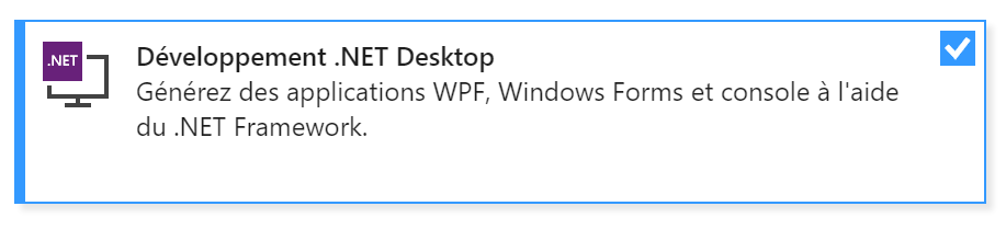 Plusieurs possibilités s’offre à vous, un installateur du type .msi ou .exe, comme par exemple celui de VLC (le lecteur multimédia) peut être converti simplement avec l’outil. Mais pour des questions pratiques nous allons faire notre propre petite application en C# et WPF et nous convertirons le .exe. Je vous invite donc à installer, si cela n’est pas déjà fait Visual studio Community 2017, qui est entièrement gratuit (ou tout autre environnement de développement). Le seul pré-requis supplémentaire est d**‘installer via l’installateur de Visual Studio la dépendance suivante (voir image-ci-dessous).** Je précise que je prends ici en exemple une application WPF, mais du Win32 en C++ est aussi complètement possible !