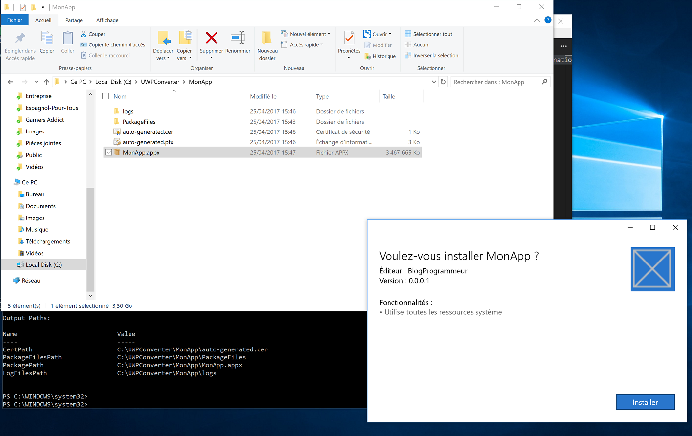 DesktopAppConverter.exe -Installer C:\Users\dezei\Desktop\DesktopAppConverter\ -AppExecutable WpfApp.exe -Destination C:\UWPConverter\ -PackageName "MonApp" -Publisher "CN=BlogProgrammeur" -Version 0.0.0.1 -MakeAppx -Sign -Verbose