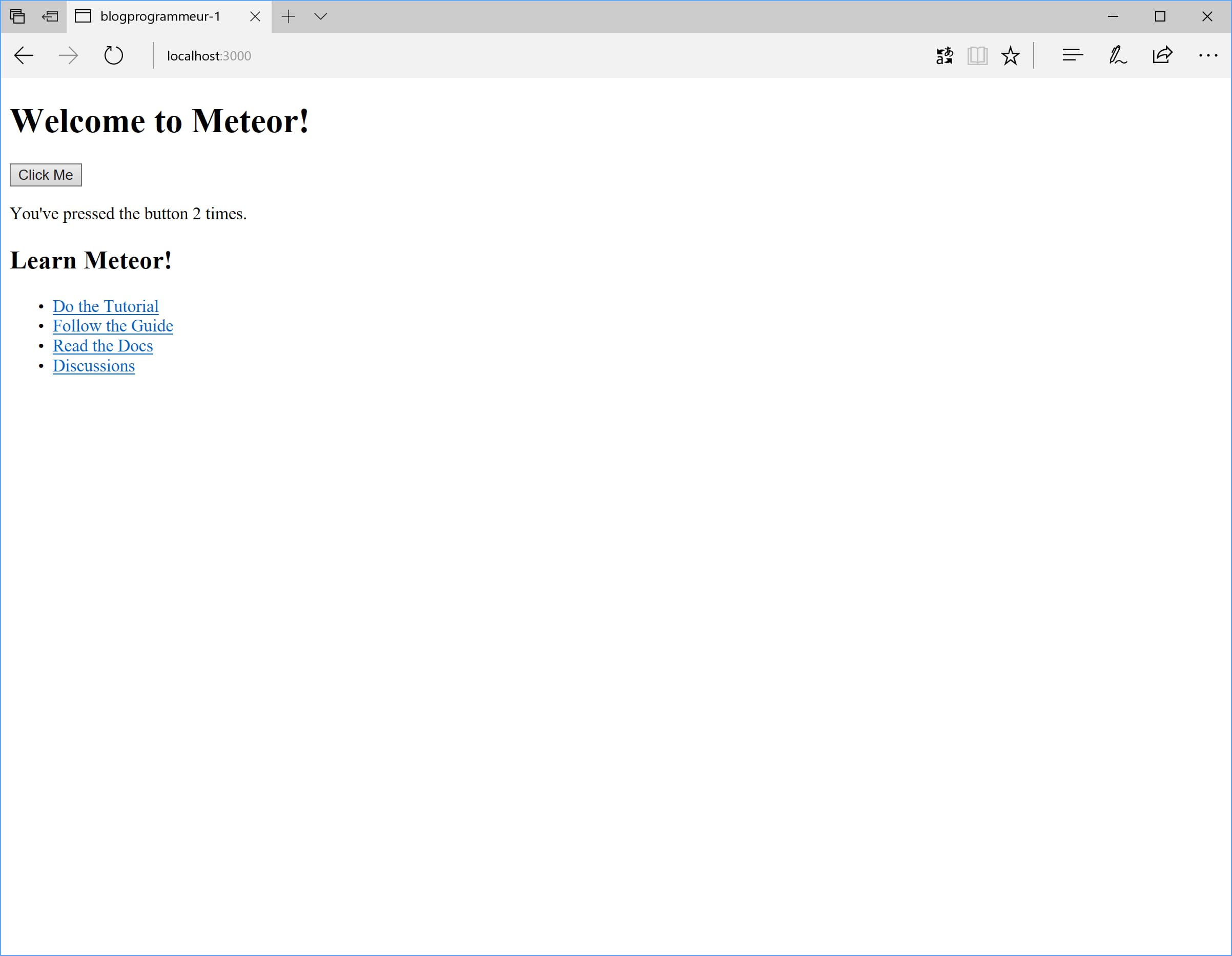 Vous remarquerez que lors d’un clique sur le bouton, le compteur augmente dans la phrase en dessous. Voilà donc votre première application Meteor ! Ce n’est pas génial ? Bon, pas vraiment en fait je suis d’accord avec vous, mais ce projet sera suffisant pour que nous puissions aborder quelques principes de fonctionnement du framework. Petit détail qui a son importance, si vous rechargez la page ou en ouvrer une autre vous remarquerez que le compteur retombe à 0, cela signifie donc que pour le moment le système fonctionne en local, dans une seule instance, chose que nous modifierons prochainement !