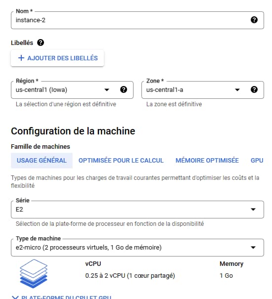 Cliquer sur le bouton “Créer une instance”. Un formulaire devrait s’afficher. Vous pouvez mettre le nom que vous souhaitez à la VM. Faite attention de bien choisir une région qui possède l’offre gratuite. Comme dit précédemment, cela concerne la région Oregon (us-west1), Iowa (us-central1) et Caroline du Sud (us-east-1). Dans “Type de machine” vous devez choisir e2-micro (2 processeurs virtuels, 1Go de mémoire).