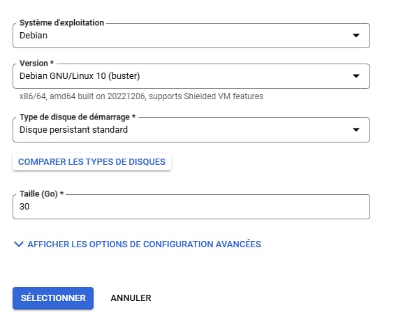 Au niveau de l’option “Disque de démarrage”, cliqué sur “Modifier”. Vous aurez le choix du système d’exploitation (cela n’a pas d’importance pour l’offre gratuite tant que ça reste Linux. Nous avons droit à un disque de 30Go avec l’offre gratuite. Veillez donc bien à mettre 30 dans le champ “Taille (Go)“. Avec l’option “Disque persistant standard” pour le type de disque de démarrage (voir capture d’écran).