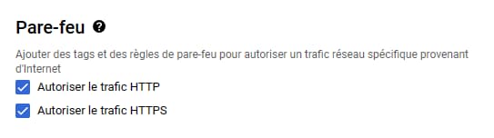 Si vous voulez hébergé du site internet. Il vous fait dans l’espace “Pare-feu” activer le HTTP et HTTPS. Comme ci-dessous.