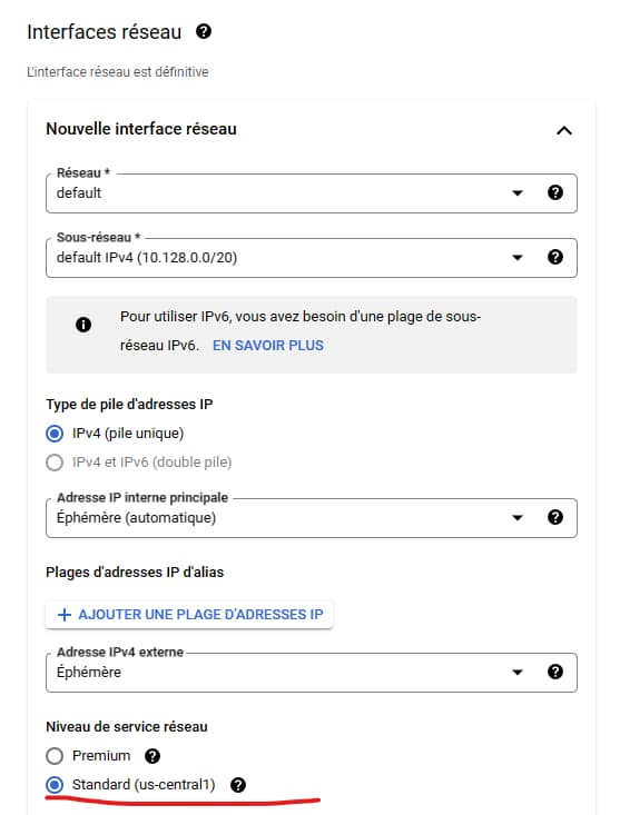 Nous voilà à la dernière étape. Vous devez ouvrir l’espace “Options avancées”, “Mise en réseau” puis “Interfaces réseau”. Cliqué sur “default” et dans “Niveau de service réseau” sélectionné “Standard” à la place de l’option par défaut qui est sur “Premium”.